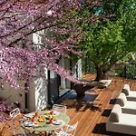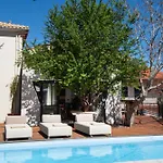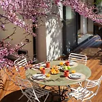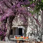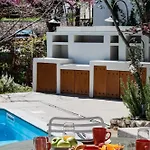 Du kan spise på en solrig gårdhave udstyret med en svømmepøl.